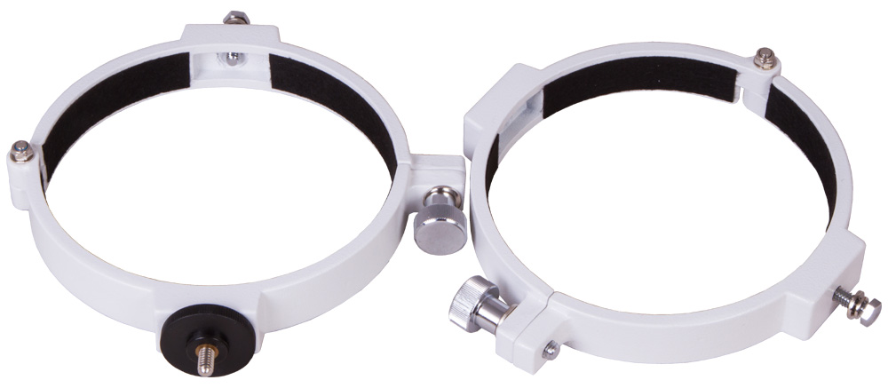 Набор крепежных колец Sky-Watcher предназначен для фиксирования оптических труб рефракторов на любых монтировках с креплением 1/4” или с креплением «ласточкин хвост». Диаметр объектива рефрактора должен составлять 150 мм. Оба кольца сделаны из металла, поэтому долговечны и надежны. Силу крепежа можно регулировать. На одном из колец есть крепление для фиксирования фотооборудования.